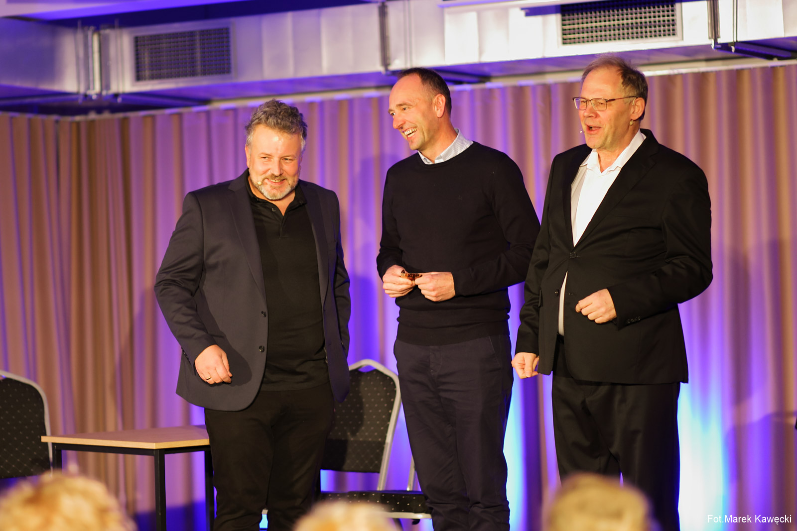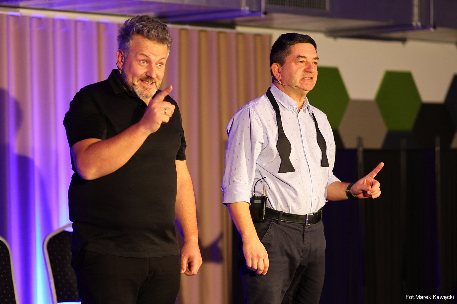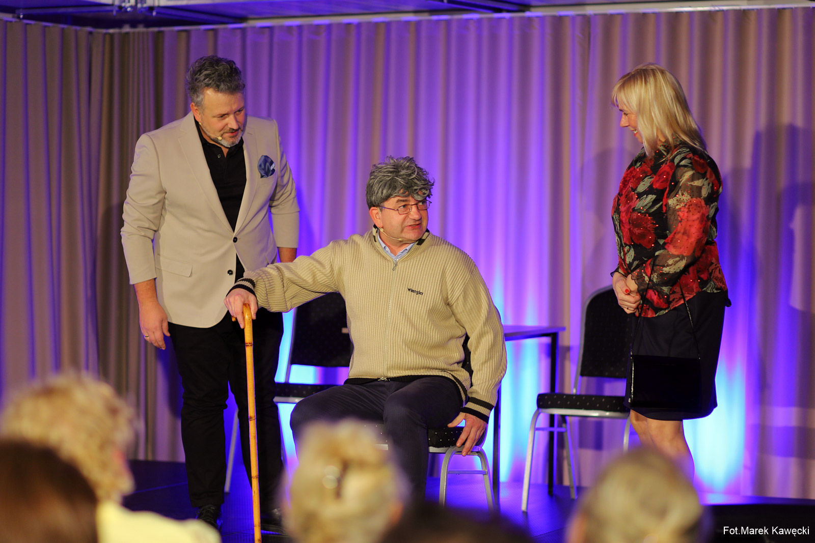 Już na starcie do wspólnej zabawy został zaproszony jeden z widzów — jak się okazało, sam wójt Gminy Dygowo, Grzegorz Starczyk. Kabareciarz obiecał paniom eleganckie goździki, ale zamiast kwiatów wręczył… torebkę goździków – tych do piernika i grzańca. Ten kulinarny „bukiet” rozbroił całą salę i idealnie ustawił klimat całego wieczoru.
