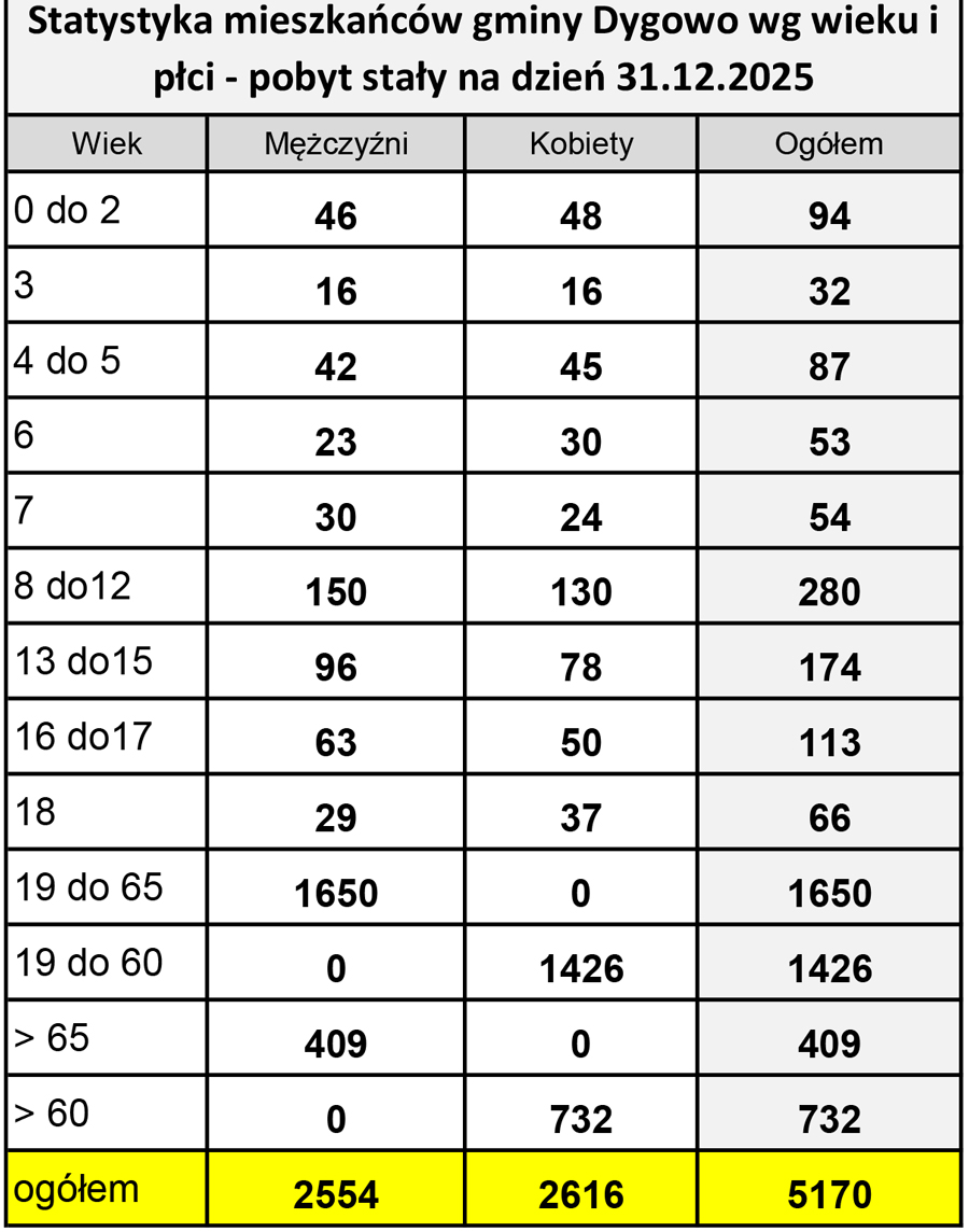 Na dzień 31 grudnia 2025 roku w gminie Dygowo na pobyt stały zameldowanych było 5170 mieszkańców. W porównaniu z rokiem 2024 liczba ludności zmniejszyła się o 159 osób.