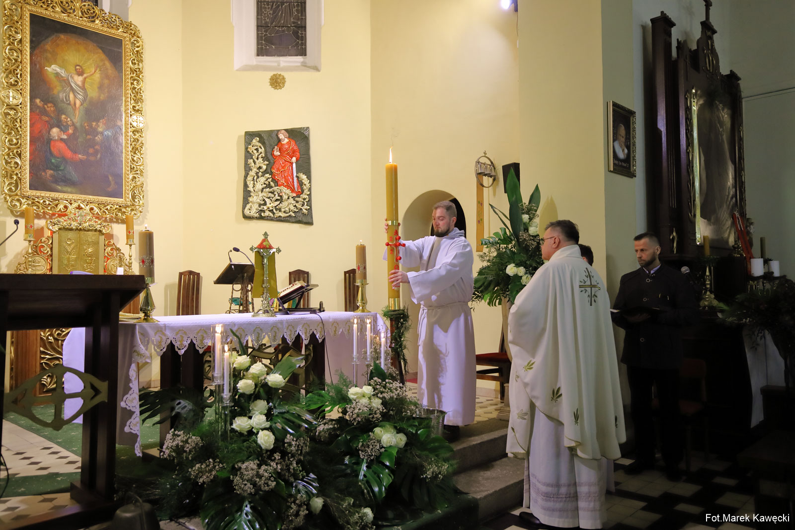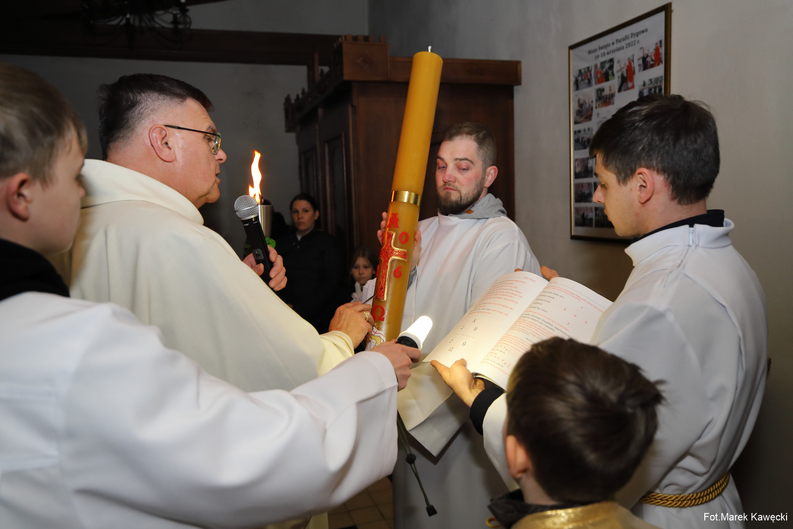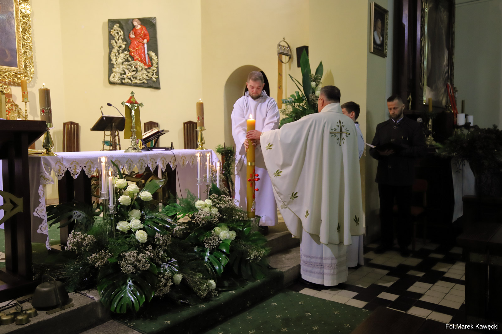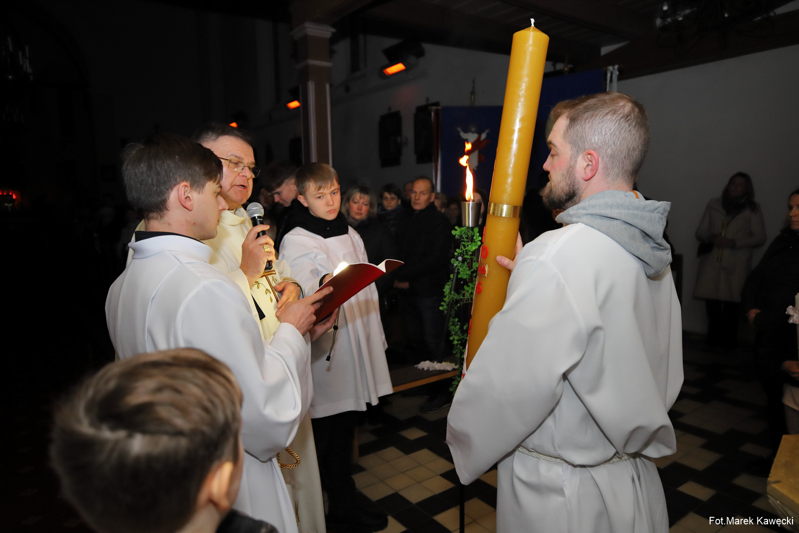 Na placu przed głównym wejściem do kościoła rozpalono ogień – symbol Chrystusa, który przynosi światło światu. Wokół niego zgromadzili się wierni. Z wnętrza świątyni wyniesiono paschał. Ksiądz dziekan Piotr Niedźwiadek poświęcił ogień, po czym rylcem wyżłobił na paschale krzyż, greckie litery Alfa i Omega oraz cyfry bieżącego roku. Następnie umieścił w świecy pięć symbolicznych gwoździ i zapalił ją od nowego ognia. Po okadzeniu paschału kapłan uroczyście wniósł go w procesji do kościoła, gdzie został umieszczony w prezbiterium – jako symbol Zmartwychwstałego Chrystusa.