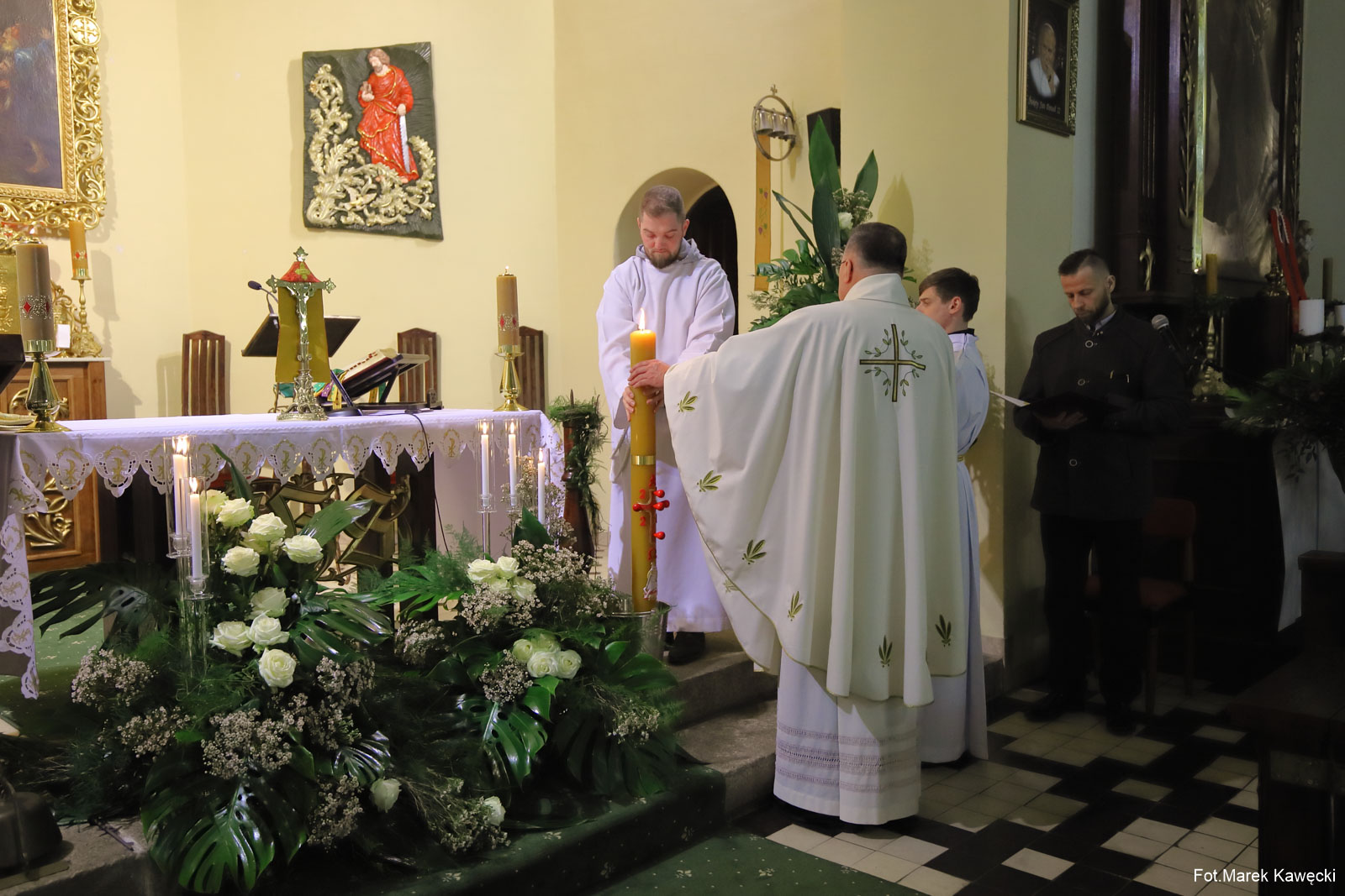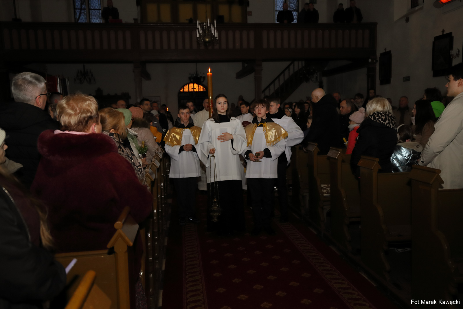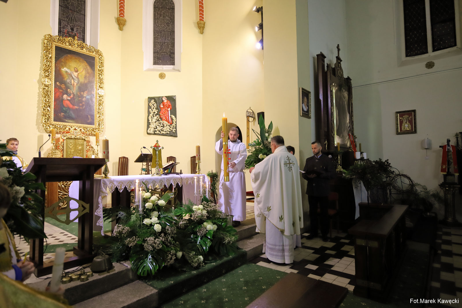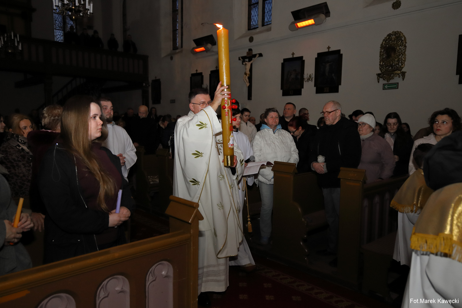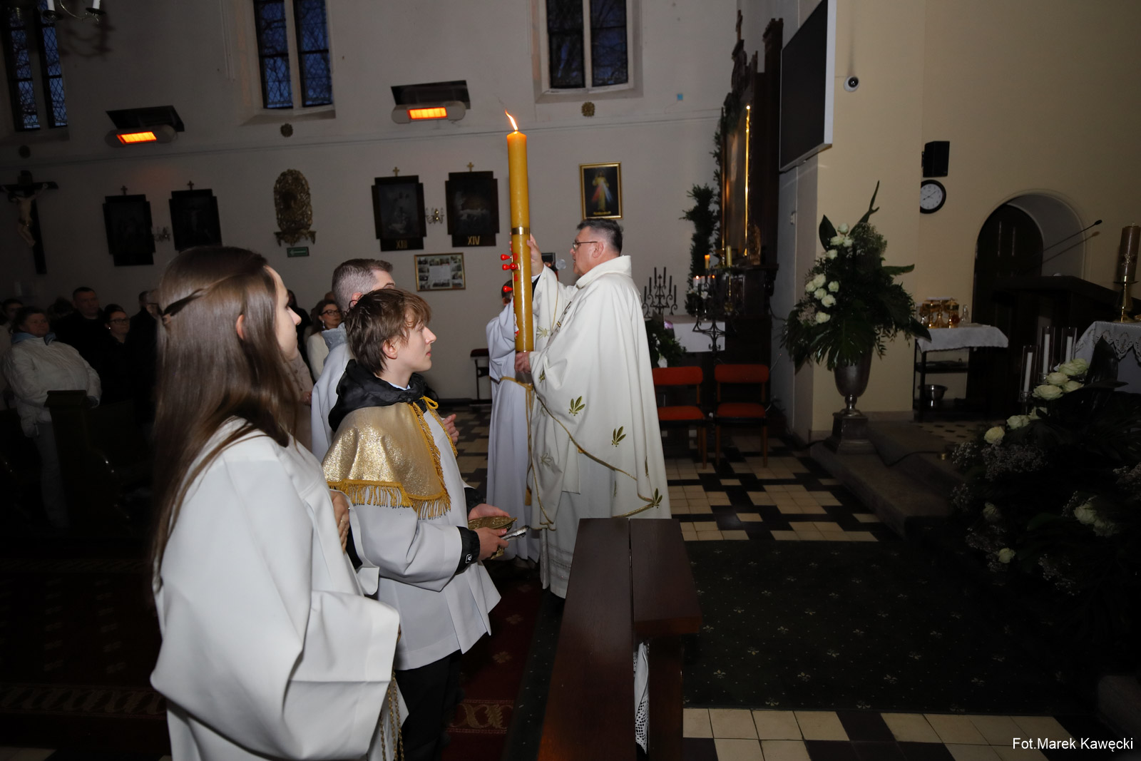 Na placu przed głównym wejściem do kościoła rozpalono ogień – symbol Chrystusa, który przynosi światło światu. Wokół niego zgromadzili się wierni. Z wnętrza świątyni wyniesiono paschał. Ksiądz dziekan Piotr Niedźwiadek poświęcił ogień, po czym rylcem wyżłobił na paschale krzyż, greckie litery Alfa i Omega oraz cyfry bieżącego roku. Następnie umieścił w świecy pięć symbolicznych gwoździ i zapalił ją od nowego ognia. Po okadzeniu paschału kapłan uroczyście wniósł go w procesji do kościoła, gdzie został umieszczony w prezbiterium – jako symbol Zmartwychwstałego Chrystusa.