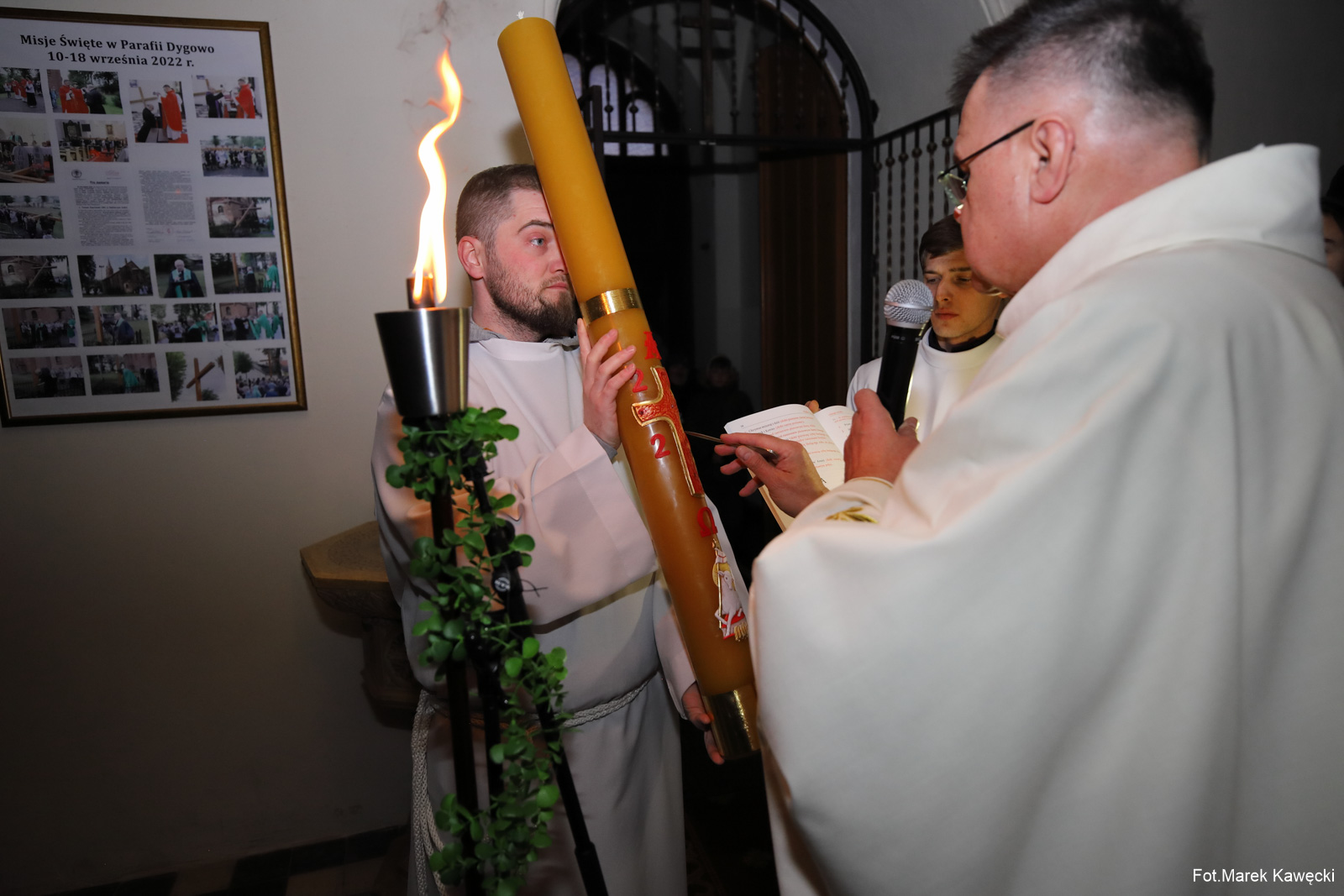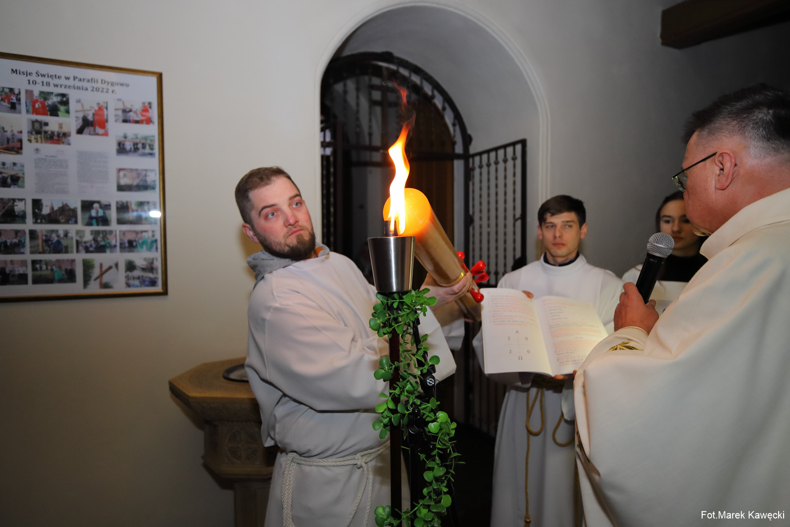 W sobotni wieczór, 19 kwietnia o godzinie 20:00, w kościele parafialnym w Dygowie odbyła się jedna z najważniejszych liturgii w roku – uroczystość Wigilii Paschalnej. To wyjątkowe nabożeństwo, bogate w symbole i głębię duchową, zgromadziło licznie wiernych, którzy wspólnie przeżywali misterium Zmartwychwstania Chrystusa.