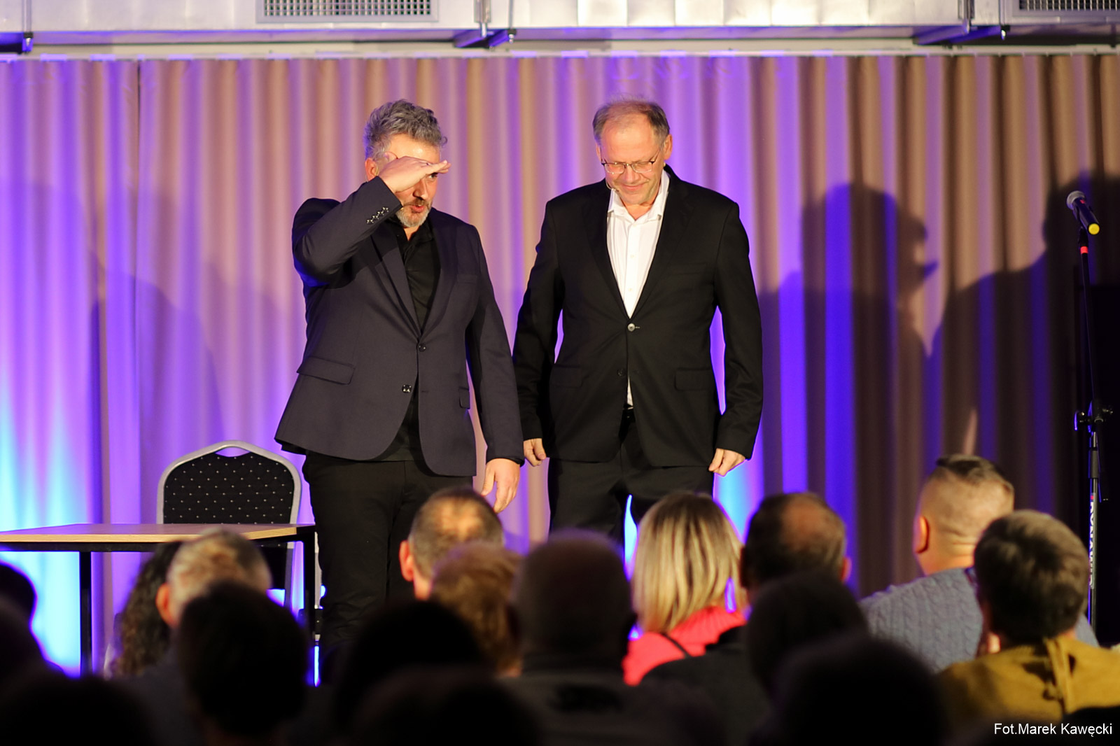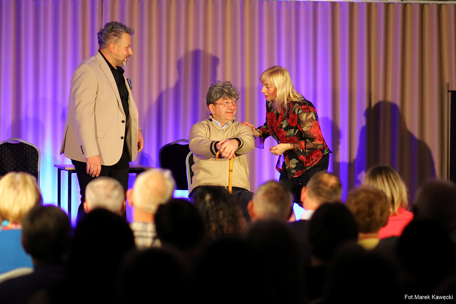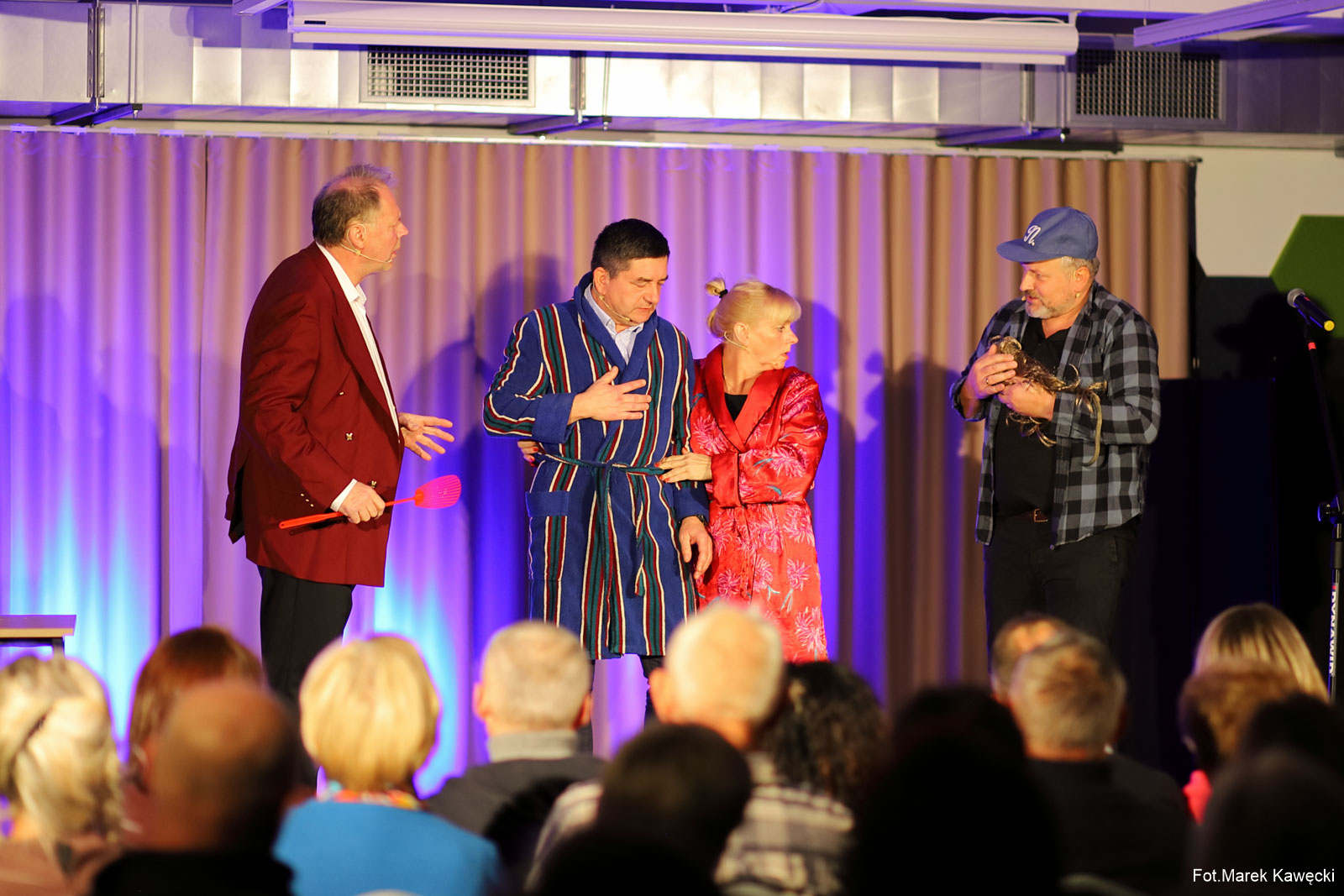 Już na starcie do wspólnej zabawy został zaproszony jeden z widzów — jak się okazało, sam wójt Gminy Dygowo, Grzegorz Starczyk. Kabareciarz obiecał paniom eleganckie goździki, ale zamiast kwiatów wręczył… torebkę goździków – tych do piernika i grzańca. Ten kulinarny „bukiet” rozbroił całą salę i idealnie ustawił klimat całego wieczoru.
