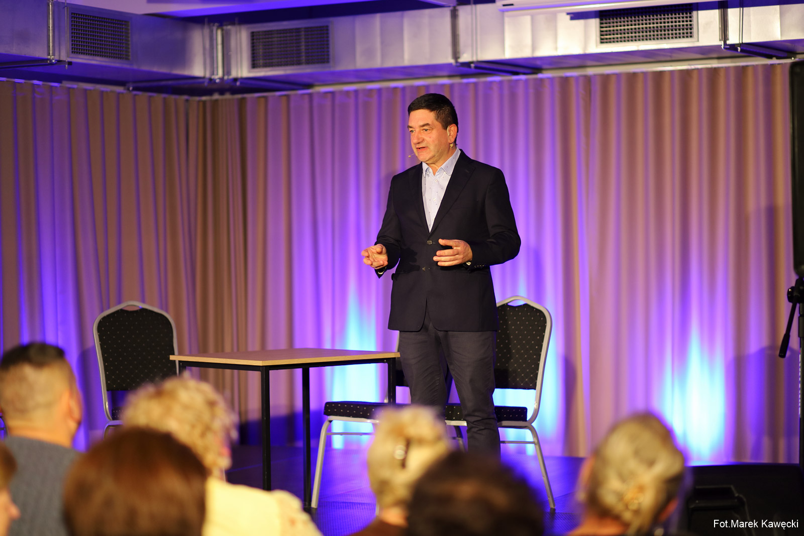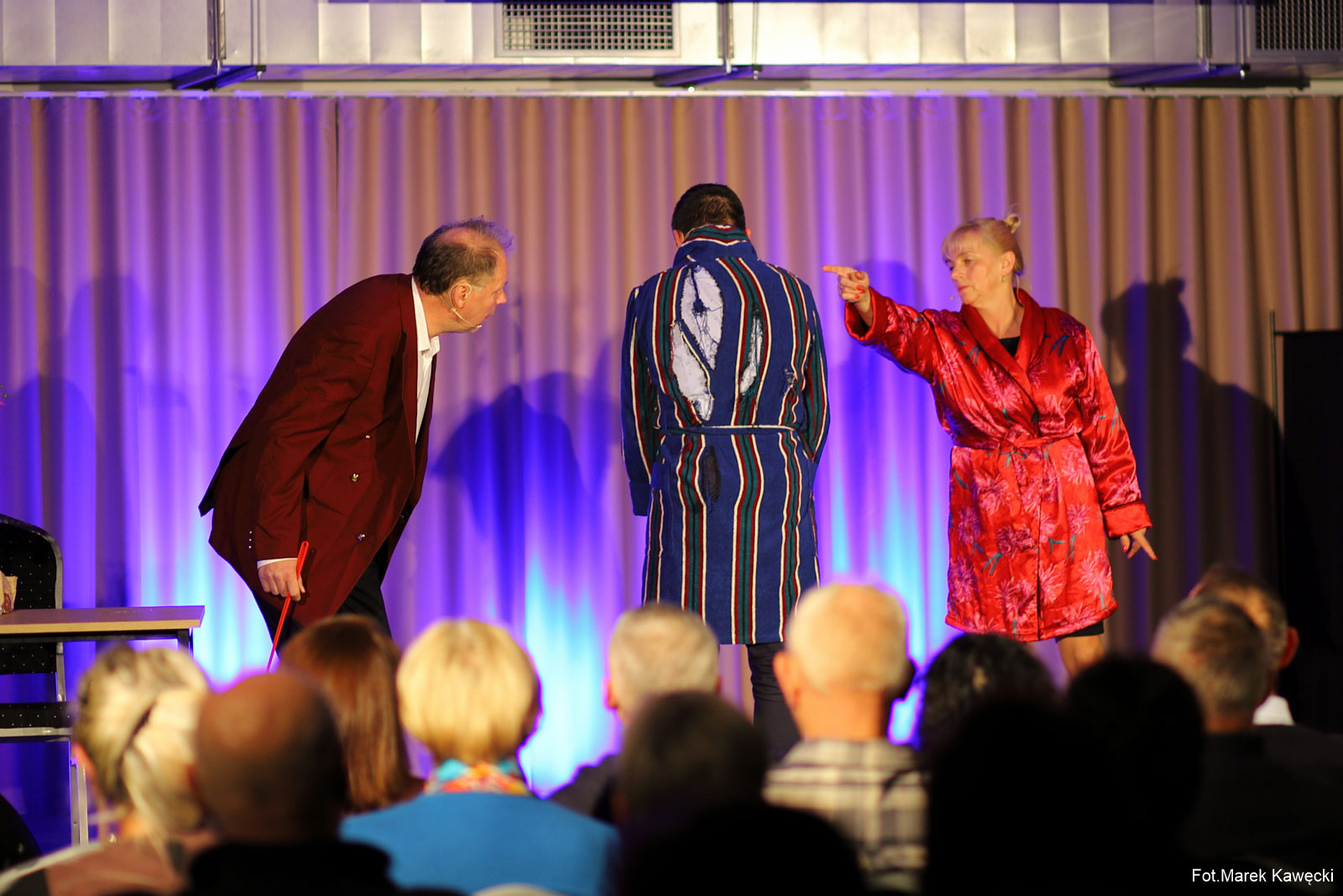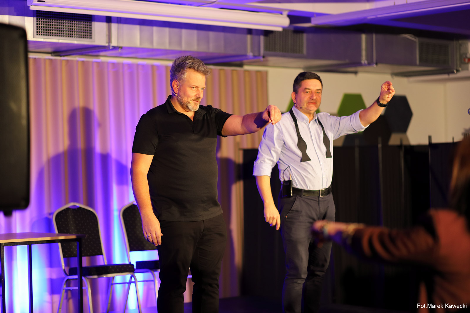 Już na starcie do wspólnej zabawy został zaproszony jeden z widzów — jak się okazało, sam wójt Gminy Dygowo, Grzegorz Starczyk. Kabareciarz obiecał paniom eleganckie goździki, ale zamiast kwiatów wręczył… torebkę goździków – tych do piernika i grzańca. Ten kulinarny „bukiet” rozbroił całą salę i idealnie ustawił klimat całego wieczoru.