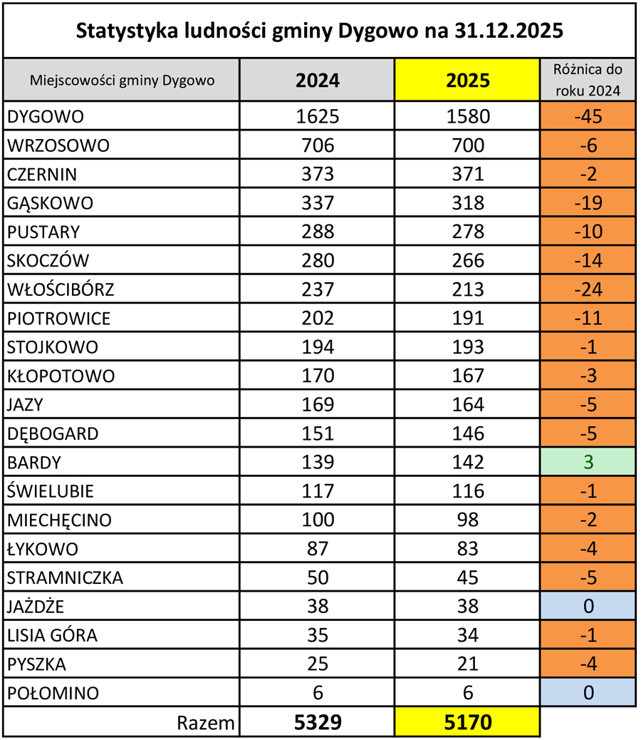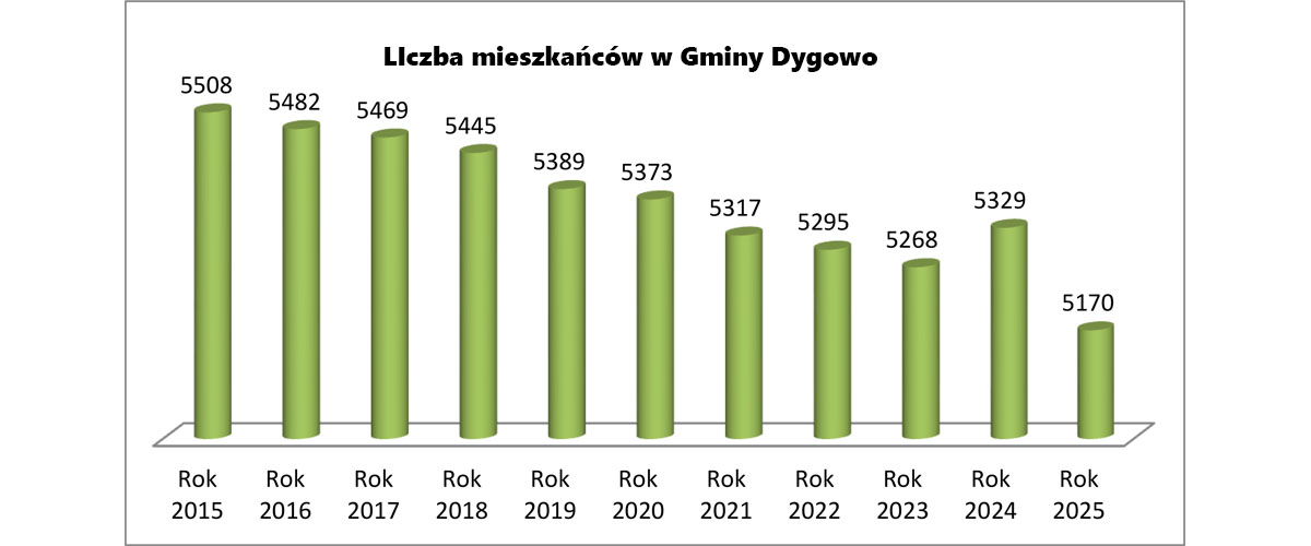 Na dzień 31 grudnia 2025 roku w gminie Dygowo na pobyt stały zameldowanych było 5170 mieszkańców. W porównaniu z rokiem 2024 liczba ludności zmniejszyła się o 159 osób.